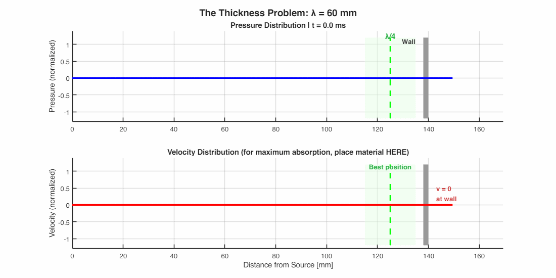 This creates a design headache. A thin foam panel stuck directly on a wall sits right where air isn’t moving—so it absorbs almost nothing. To catch a 100 Hz bass tone (wavelength ≈ 3.4 m), you’d need material 85 cm thick, or mount a thinner layer on standoffs to position it at the velocity maximum.