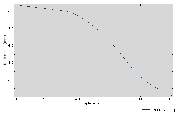 The neck radius decreases from the initial 6.4 mm to approximately 4-5 mm at maximum displacement, representing a significant (>30%) reduction in cross-sectional area.
