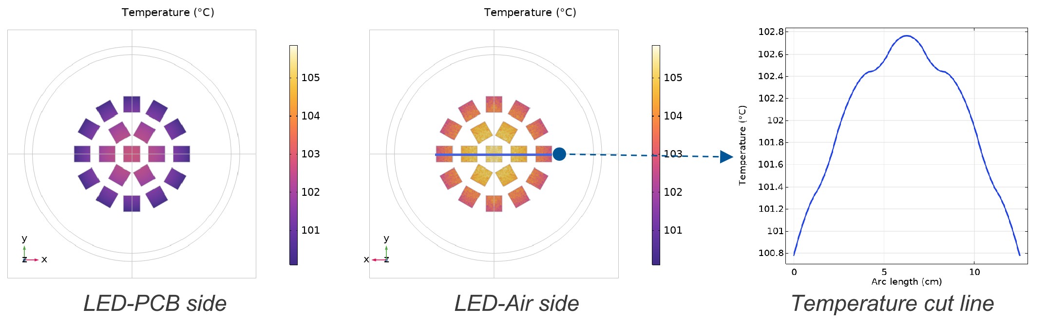 The temperature distribution reveals a clear gradient. Even within a single LED chip, the temperature is non-uniform. The side in contact with the PCB is cooler than the side facing the air, as the aluminum PCB acts as a heat spreader, conducting heat away more efficiently than the air can remove it via convection.