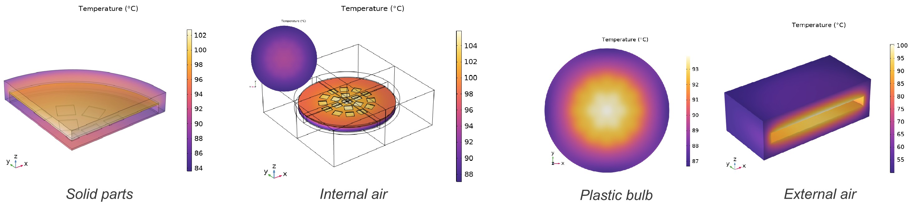 - Fluid Domains: Both the interior and exterior of the bulb are filled with air. The model assumes the bulb is sealed, meaning there is no mass flow exchange between the internal and external air domains, though heat is transferred across the shell wall.