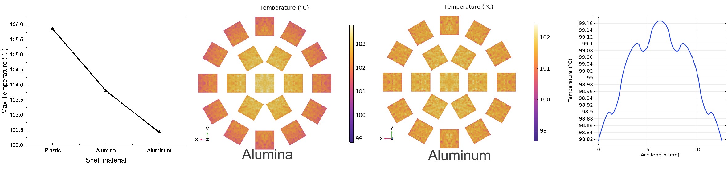 Result: Using a material with higher thermal conductivity yields results similar to increasing LED spacing—lower peak temperatures.