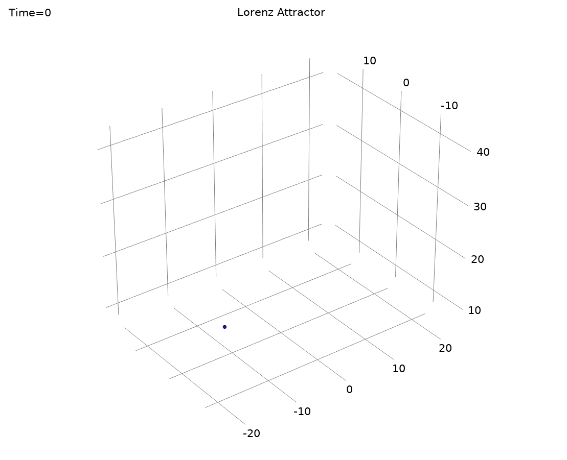 # Load required packageslibrary(deSolve)library(plotly)# Define the Lorenz attractor parametersdt<-0.02sigma<-10rho<-28beta<-8/3# Initial conditionsx0<-2y0<-1z0<-1# Define the Lorenz systemlorenz<-function(t,state,parameters){with(as.list(c(state,parameters)),{dx<-sigma*(y-x)# dx/dtdy<-x*(rho-z)-y# dy/dtdz<-x*y-beta*z# dz/dtlist(c(dx,dy,dz))})}# Set up parameters and initial stateparameters<-c(sigma=sigma,rho=rho,beta=beta)state<-c(x=x0,y=y0,z=z0)# Time spantimes<-seq(0,1500*dt,by=dt)# Solve using Dormand-Prince methodsol<-ode(y=state,times=times,func=lorenz,parms=parameters,method="ode45")# Convert to data framesol_df<-as.data.frame(sol)# Create interactive 3D plot using plotlyfig<-plot_ly(sol_df,x=~x,y=~y,z=~z,type="scatter3d",mode="lines",line=list(color="blue",width=2))%>%layout(title="Lorenz Attractor",scene=list(xaxis=list(title="X Axis",range=c(-30,30)),yaxis=list(title="Y Axis",range=c(-30,30)),zaxis=list(title="Z Axis",range=c(0,60))))# Display the plotfig