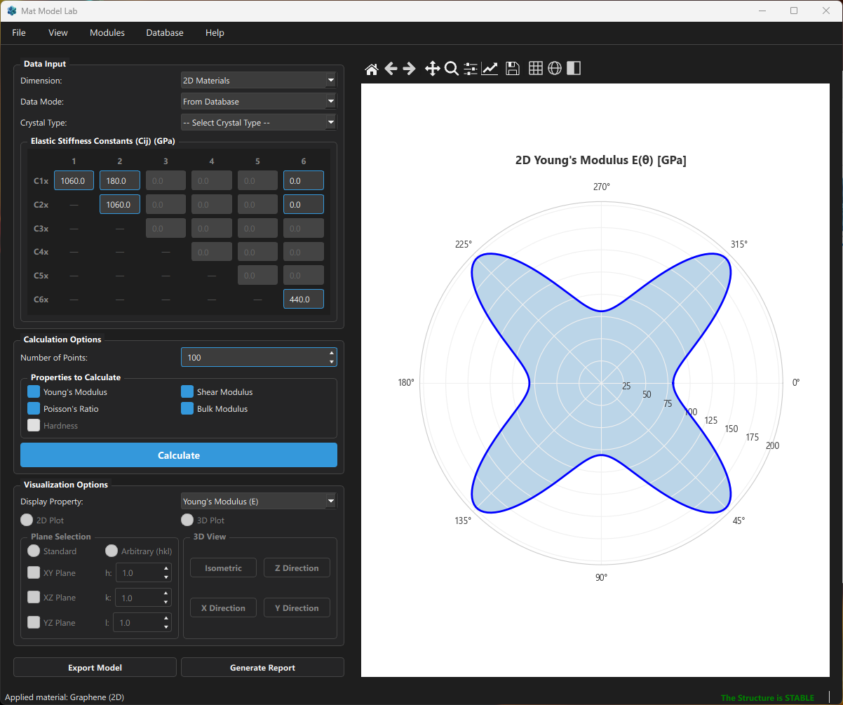 Mat Model Lab includes dedicated support for elastic analysis of two-dimensional materials. Taking graphene as an example:
