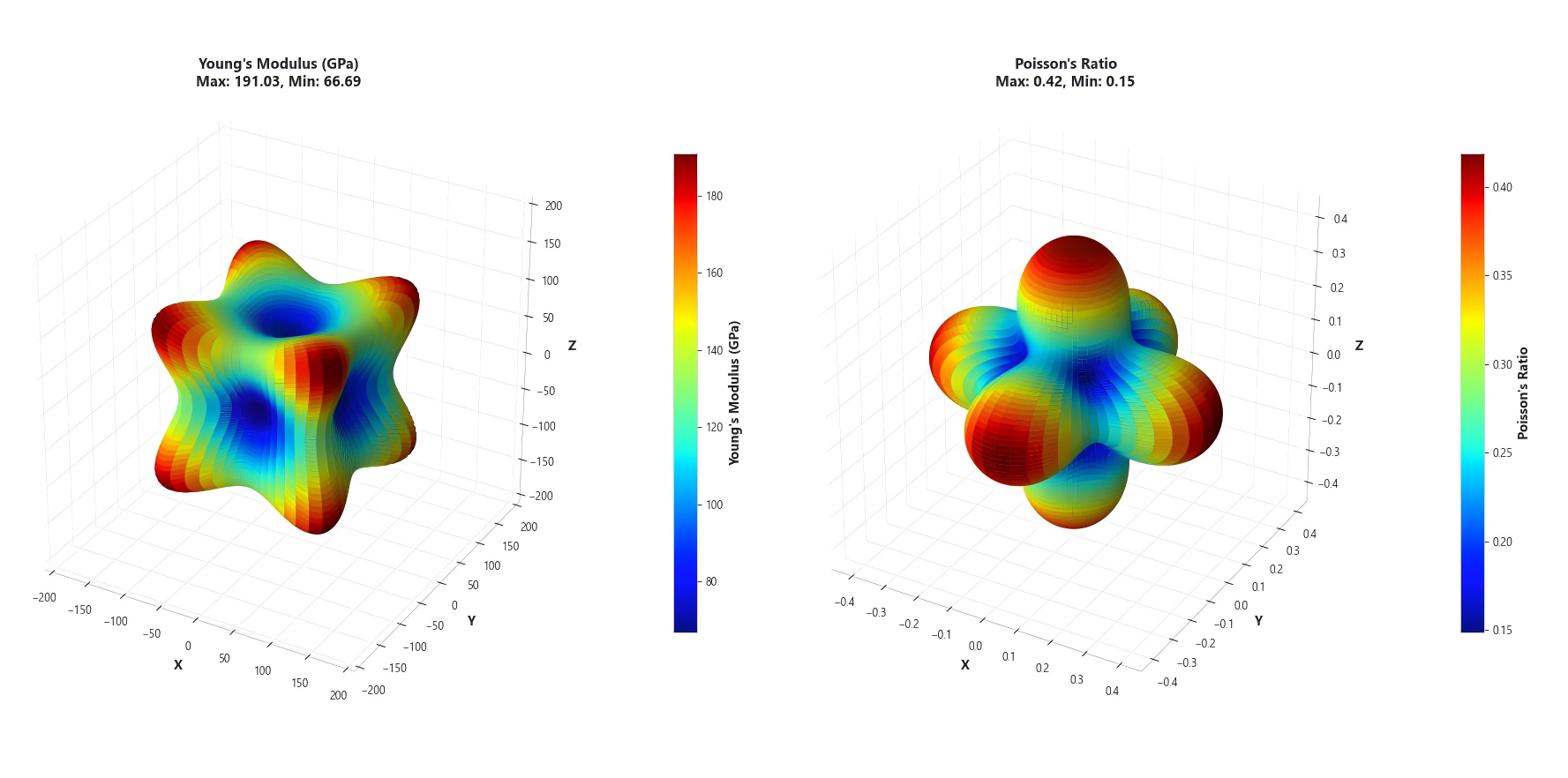 The results show that the anisotropy ratio of Cu is $A = 2C_{44}/(C_{11}-C_{12}) \approx 3.21$, making it a strongly anisotropic FCC metal. The 3D plot clearly shows that Young’s modulus is maximum along the $[111]$ direction and minimum along the $[100]$ direction.