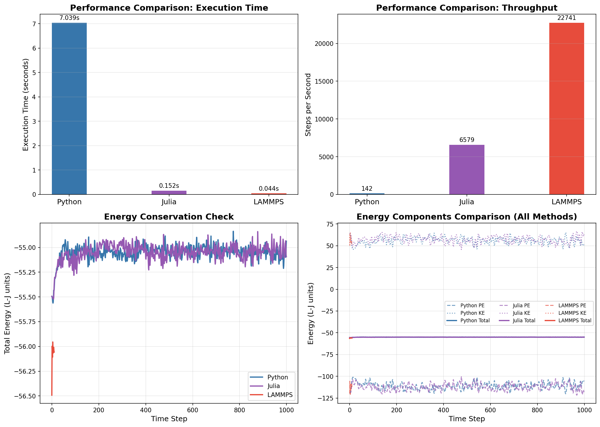 Performance and Energy Comparison: Python vs Julia vs LAMMPS